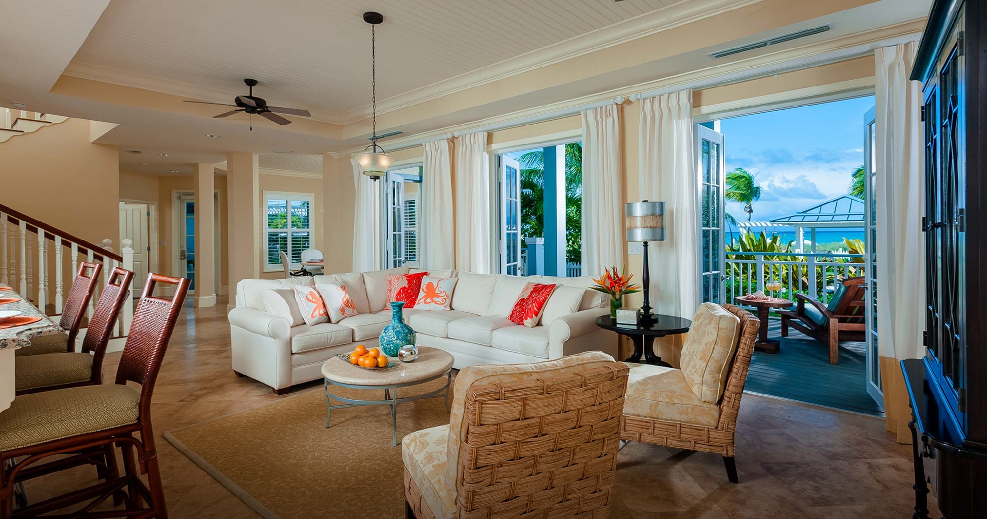 Opening out directly onto the powdery white-sand beach from its two oversized patios, this suite features a king size mahogany, four poster bed, adorned with a plush duvet, twin daybed with trundle and lounge sleeping chair, 42′ flat screen TV plus a bar area with its own refrigerator